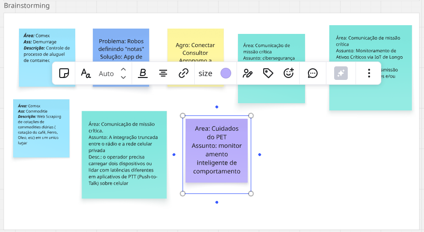 Os materiais de brainstorm e de alinhamento da equipe evidenciam o processo de divergência e convergência conduzido na etapa inicial do projeto. A partir dessas discussões, foi possível definir com clareza a dor principal: a dificuldade dos tutores em perceber alterações sutis de comportamento com antecedência suficiente para agir de forma preventiva.