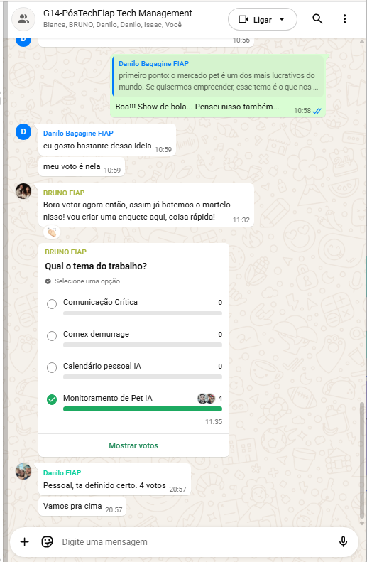 A convergência para o PetWell AI ocorreu porque a proposta reúne relevância da dor, clareza de valor, viabilidade de MVP e posicionamento ético mais sólido, já que monitora mudanças de padrão sem se apresentar como ferramenta de diagnóstico.